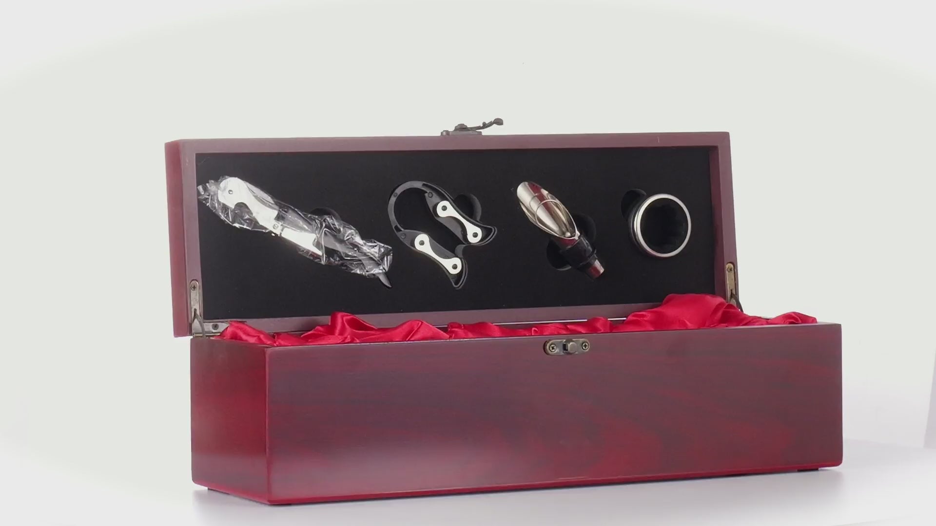 Премиум кутия за подарък, изработена от пластмаса с покритие, имитиращо махагоново дърво с червеникав оттенък. Вътрешността е облицована с червен сатенен текстилен материал. Кутията е съвместима с класическите бутилки вино и включва пълен комплект полезни аксесоари за сервиране на напитката.