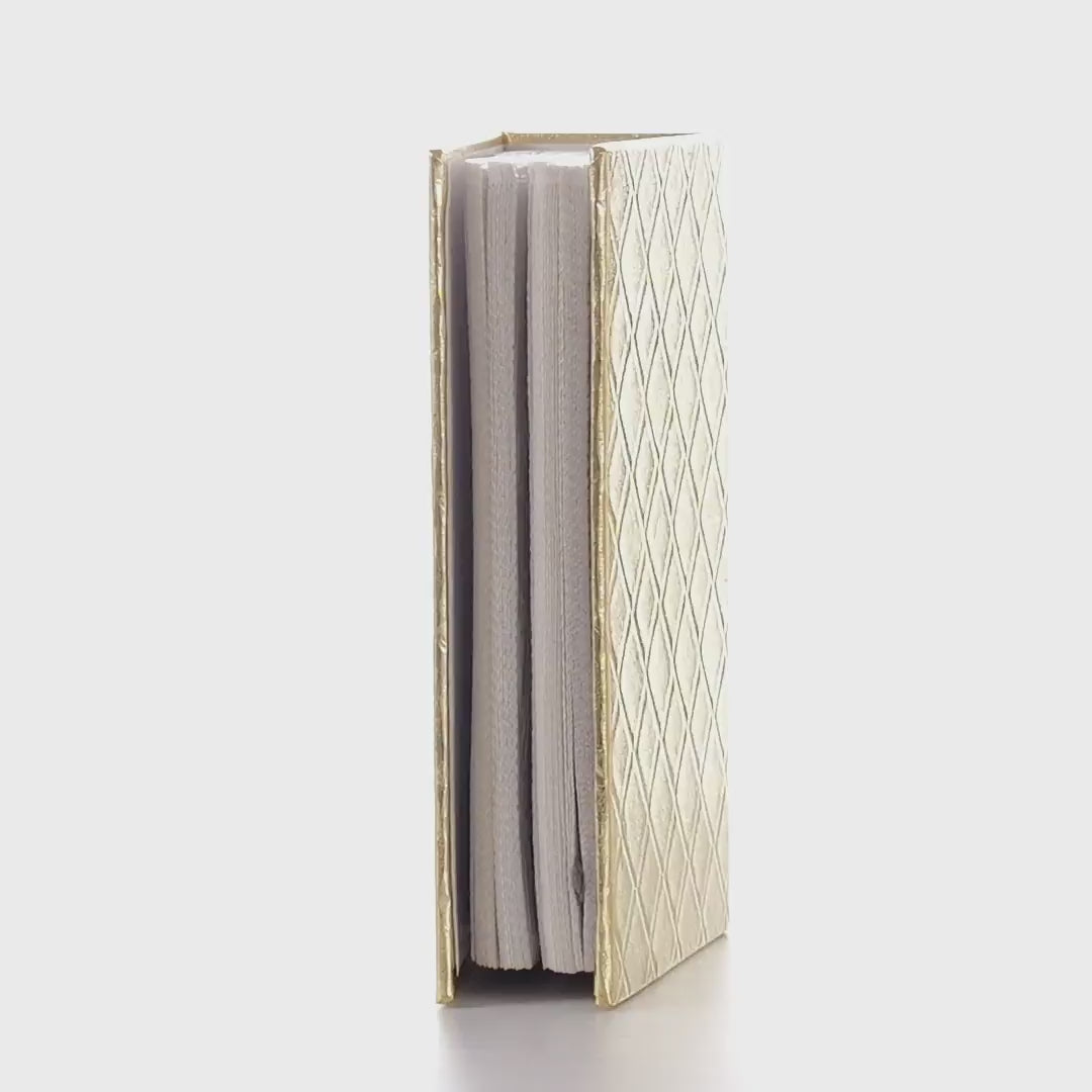 Klasszikus fotóalbum dombornyomott borítóval, arany és ezüst változatban elérhető. Elegáns, geometriai mintázatú textúrája révén kifinomult módon alkalmas az emlékek megőrzésére és bemutatására. Az album 100 db 10×15 cm-es fénykép tárolására alkalmas, átlátszó zsebekkel védve.