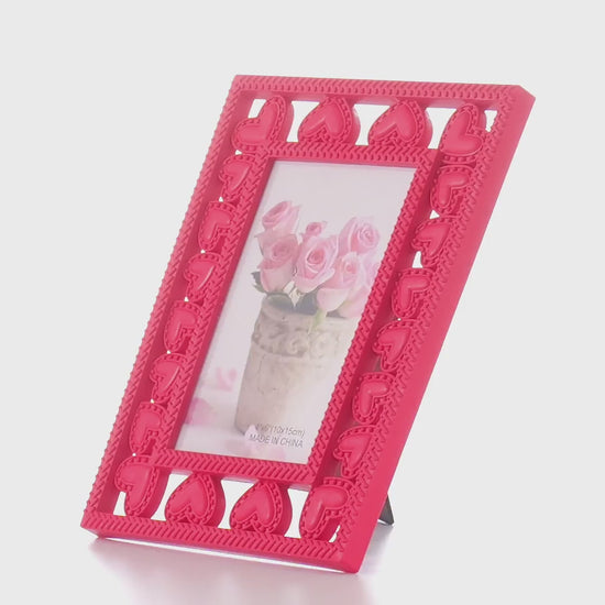 Dekoratív műanyag képkeret, piros színű, szív alakú mintával a kereten. Könnyen illeszkedik az otthoni dekorációba vagy szimbolikus elemként különleges eseményekhez.
