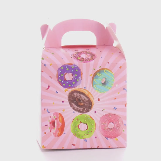 Cardboard box with handle for mugs with a printed donut pattern on the cardboard